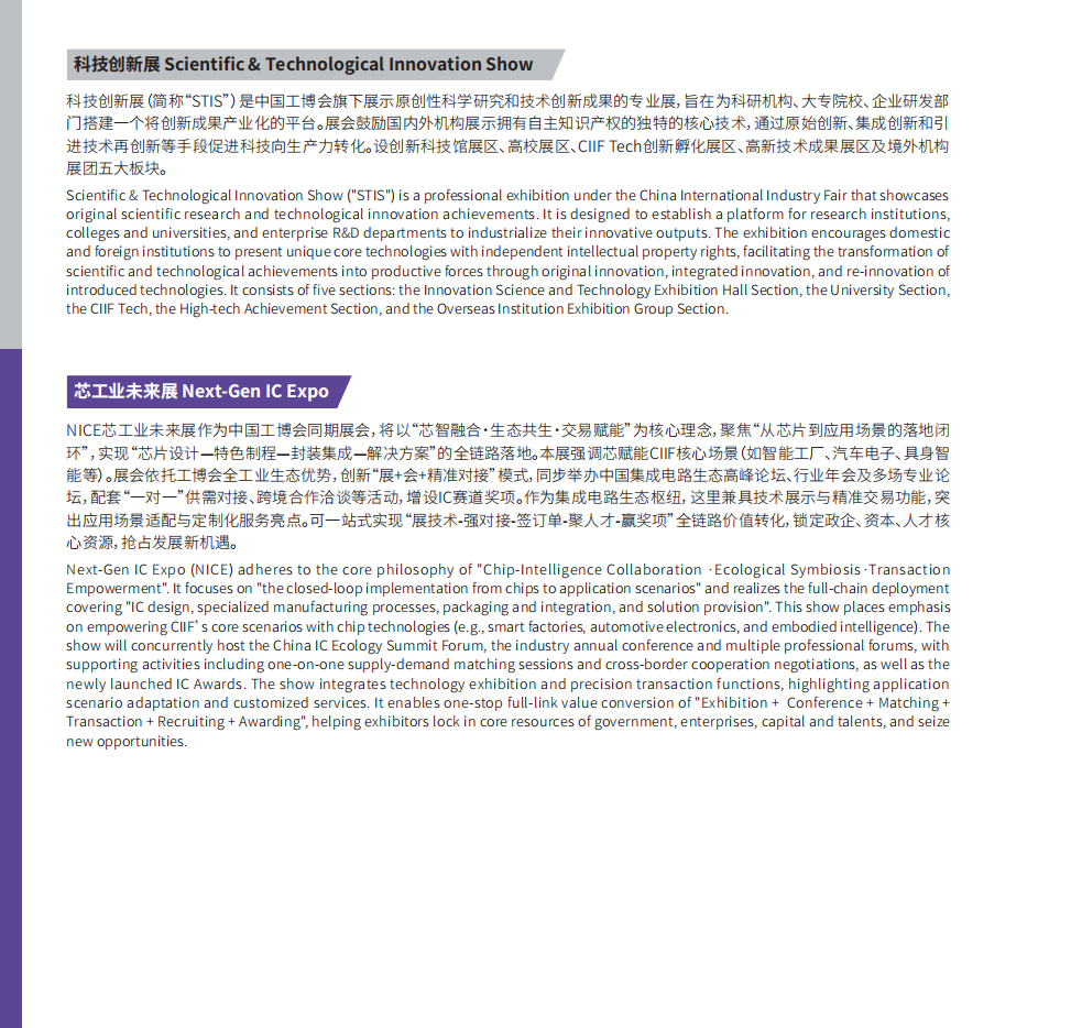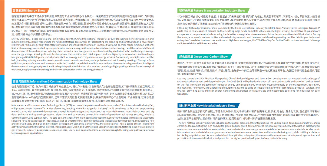 数控机床与金属加工展(MWCS):工业母机、激光/增材制造、精密加工、智能刀具/功能部件 工业自动化展(IAS):智能制造系统、运动控制、智能传感、工业IT、数字孪生 机器人展(RS):工业/协作/人形机器人、AGV/AMR、核心部件、行业解决方案(深化人形机器人专区) 新一代信息技术与应用展(ICTS):工业互联网、AI、算力、物联网、工业软件、低空经济 智慧能源展(ES):新能源、核电、储能、能源数字化、绿色电力系统 绿色低碳展(GLCS):工业节能、余热回收、碳管理、循环经济、绿色工厂 新材料产业展(NMIS):高性能合金、复合材料、生物制造、前沿材料 智行未来展:新能源与智能网联汽车、核心零部件、智能座舱 科技创新展:前沿技术、高校/科研院所成果、创新孵化