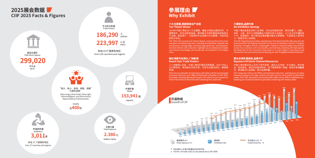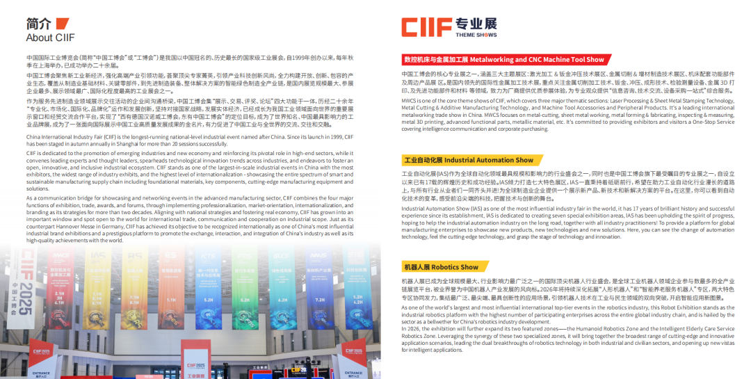 展会名称:第26届中国国际工业博览会(CIIF 2026) 时间地点:2026年10月12–16日,国家会展中心(上海) 主题:工业聚能,新质领航(聚焦高端化、数字化、绿色化) 规模:展览面积28–30万㎡,9大专业展区;3000+展商(国际占比超30%,世界500强/龙头超40%);预计20万+专业观众 定位:中国工业领域“奥林匹克”,亚太顶级工业展,全球智能制造与绿色工业核心交流平台