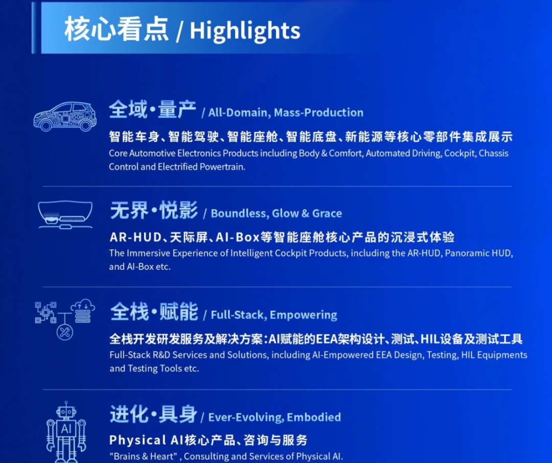 经纬恒润在互动平台回答投资者提问时表示,公司将在2026北京车展上进行核心零部件的集中展示,涵盖智驾域(传感器和算力平台等)、车身域(物理区域控制器和车门域控制器等)、动力域(多合一控制器和直流-直流转换器等)、底盘域(转向控制器和悬架控制器等)及座舱域(HUD、AI-Box、氛围灯和投影大灯等)五大类。同时,公司将提供智能座舱相关产品,如AR-HUD、PHUD、CMS、AI-Box等的实车体验;并进行咨询类服务的全链条展示,包含国产化方案,国产化工具等;以及大小脑控制器,电子电气架构设计和测试等机器人相关服务。公司展位位于首都国际会展中心(新国展二期)B2馆B2B31。