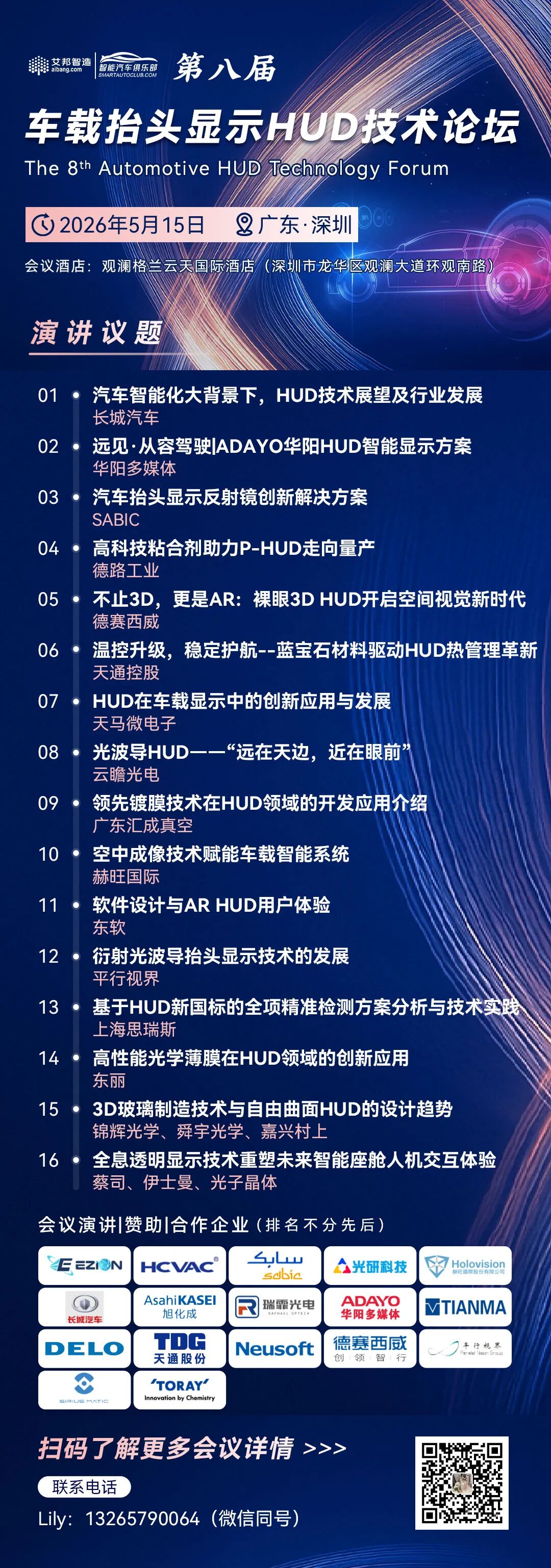 艾邦现建有汽车抬头显示HUD微信群,大陆电子、未来黑科技、泽景、水晶光电、华阳多媒体、法雷奥、怡利电子、前海智云谷、613所、矢崎仪表、电装、日精、疆程、德赛西威、睿维视、上海浦创、炽云科技、舜宇光学、拜波赫、北汽、日产、比亚迪、一汽、上汽、蔚来、吉利、锦辉光学、3M、积水化学、福耀玻璃、富兰光学、亮宇光学、京瓷、芯鼎微、瑞霏光电、长步道光学等,欢迎扫码加入。加入前请转发本文。