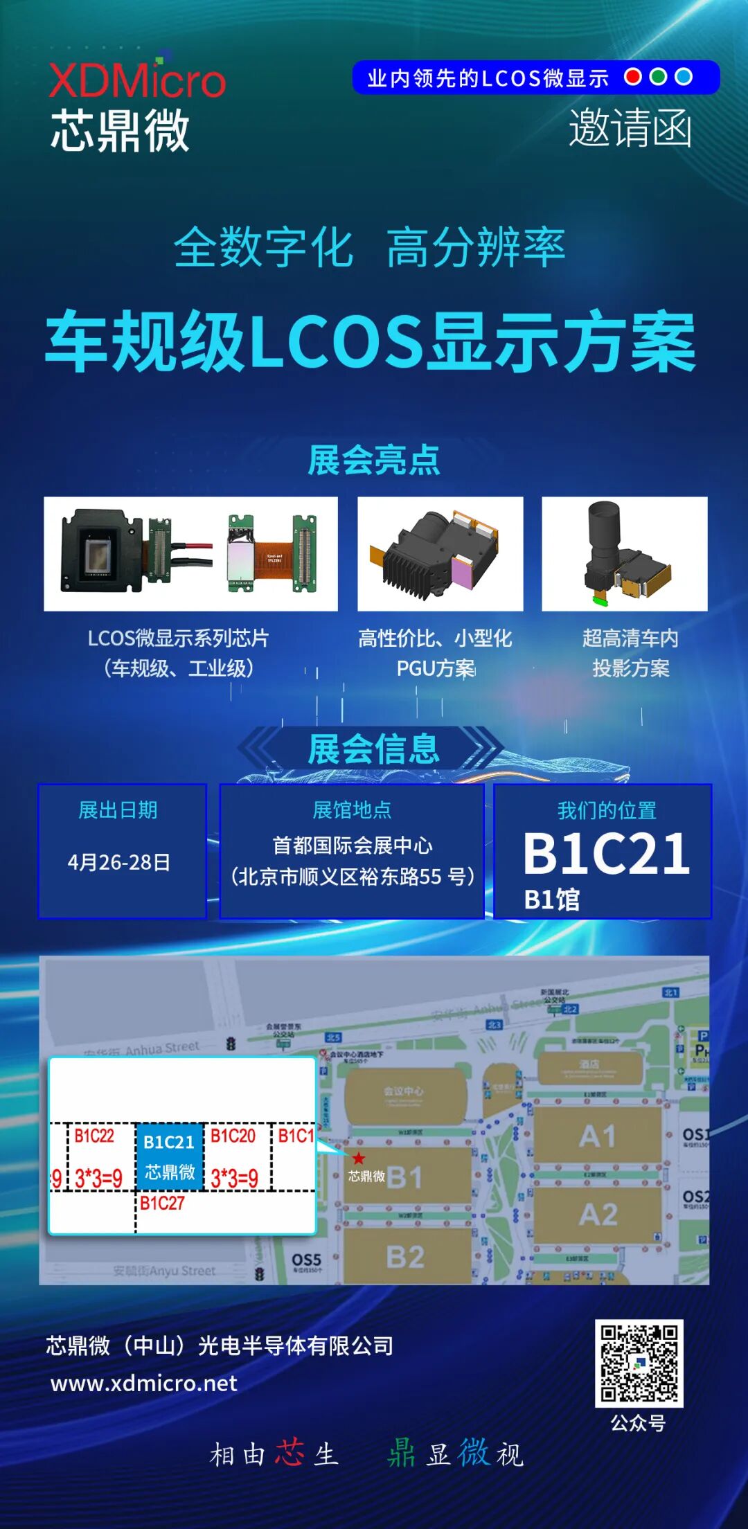 芯鼎微(中山)光电半导体有限公司是专业的光电半导体器件公司及业内领先的硅基液晶(LCoS)微显示方案供应商,一直专注于设计、生产并销售各类便携式投影的光调制解决方案,并提供车规级、工业级及消费级的高清(720p)、全高清(1080p)及超高清(4K/8K)微显示屏、图像驱动和光机引擎的全面产品系列,可广泛应用于车载抬头显、车内外投影等车载显示、智能投影、元宇宙近眼显示、3D打印等场合并实现全球销售。芯鼎微拥有完备的百级、千级及万级洁净车间及包括IATF16949在内的全面质量体系有效保证产品质量,全国产化供应链及国际先进的LCOS封测产线保证数百万级年产能,用于液晶灌装、液晶模组和光学引擎等产品的封装测试及各种研发,为客户提供一站式全面服务。