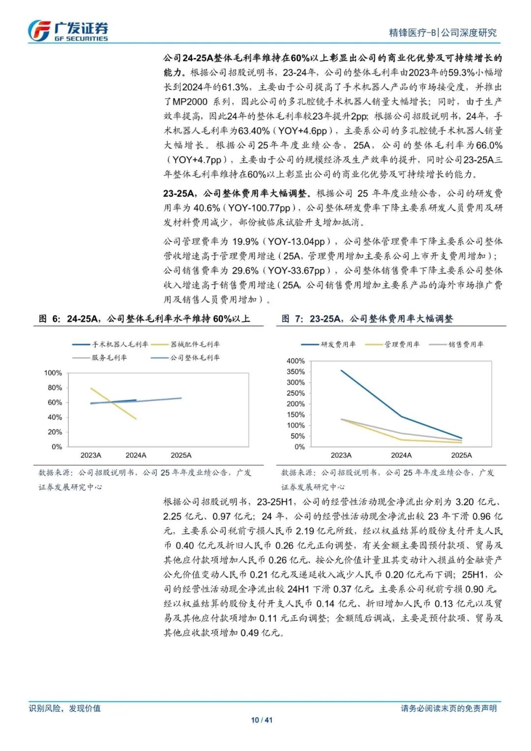 公司国内/海外快速布局,25 年业绩逆势提升。根据公司 25 年年度业绩公告,公司实现营收 4.56 亿元(YOY+184.8%),其中手术机器人及器械配件业务实现收入4.55亿元(YOY+184.7%),服务业务收入实现81.6万元(YOY+270.9%),业绩高速增长主要系公司于国内/海外实现商业化快速布局;25 年底,公司国内/海外分别装机交付 46 台、54 台;毛利率为 66.0%YOY+4.7pp),主要由于公司的规模经济及生产效率的提升。