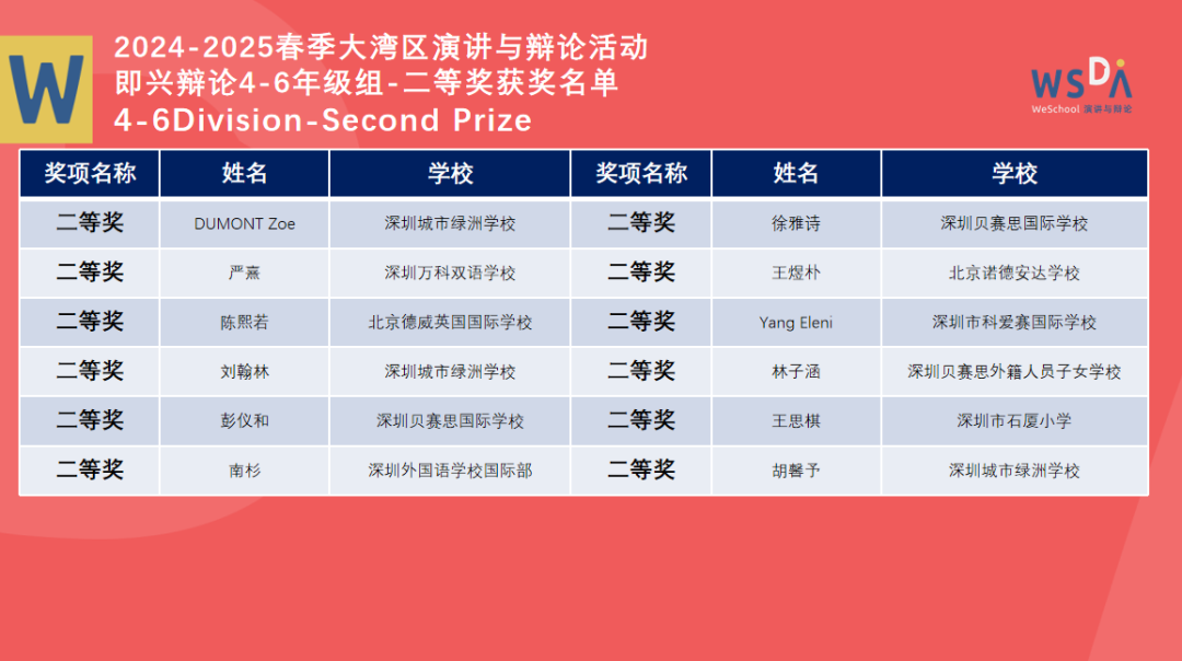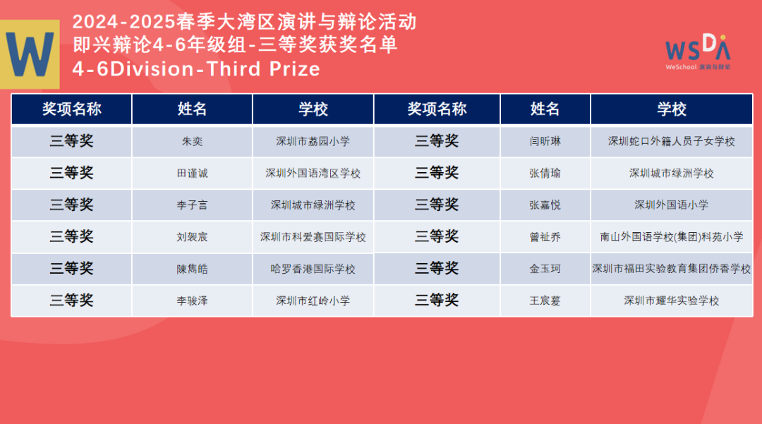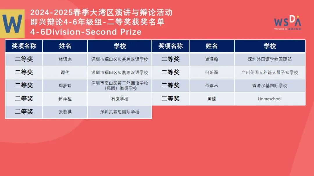 5月24日,2024-2025 WSDA春季大湾区小学生演讲与辩论活动即兴辩论在掌声与成长中圆满收官。一百多位来自粤港澳大湾区的年轻辩手,经过数轮激烈的对抗和思维碰撞,以缜密的逻辑架构和敏锐的临场应变,完美诠释了即兴辩论的魅力。