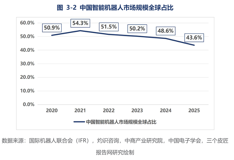 中国占全球市场比重从2021年的54.3%高点持续下降至2025年的约43.6%。原因有三:海外市场加速追赶、产品结构差异(中国以家用和商用配送为主,单价较低)、人形机器人统计口径影响(海外企业融资和样机销售规模增长迅猛,而中国人形机器人多数仍处研发和小批量试产)。