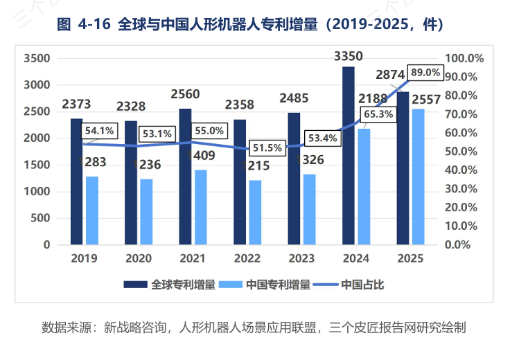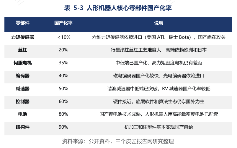 专利方面,2019年至2025年,中国人形机器人专利增量占全球比重从54.1%提升至89.0%,接近全球九成。但核心零部件国产化率参差不齐:力矩传感器不足10%,丝杠约20%,伺服电机约35%,减速器约50%。