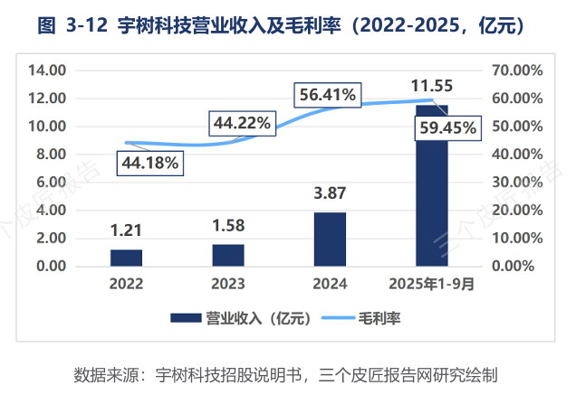 宇树科技2025年前三季度营收11.55亿元,毛利率59.45%;人形机器人出货量超5500台,全球第一;四足机器人与人形机器人双轮驱动,核心零部件自研率超70%。