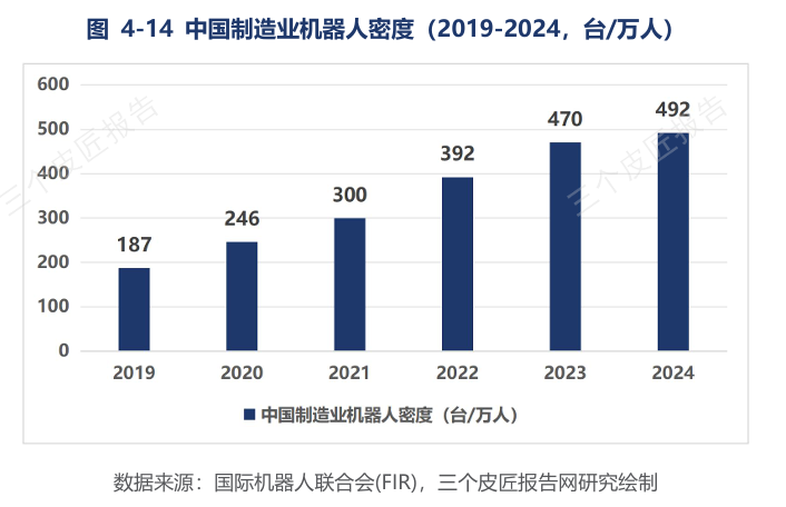 2024年中国制造业机器人密度达492台/万人,已超越德国和日本,位居全球第三(仅次于韩国和新加坡),提前一年基本完成《“机器人+”应用行动实施方案》2025年目标(500台/万人)。