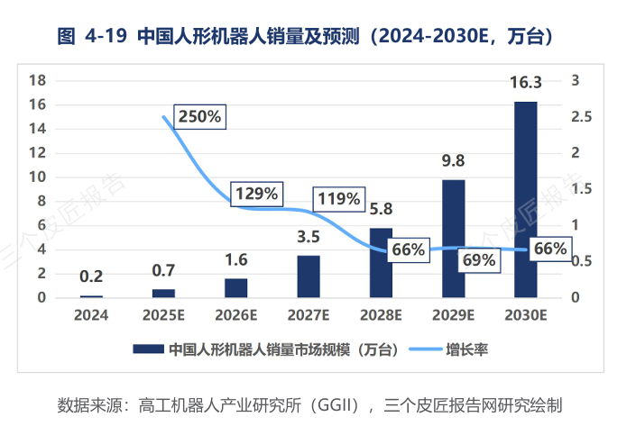 2025年全球人形机器人出货量约1.8万台,中国企业包揽前六宇树科技(超5500台)和智元机器人(超5168台)位居前二。2024年为人形机器人商业化元年,销量仅0.2万台;预计2030年中国人形机器人销量将达16.3万台,市场规模达254亿元