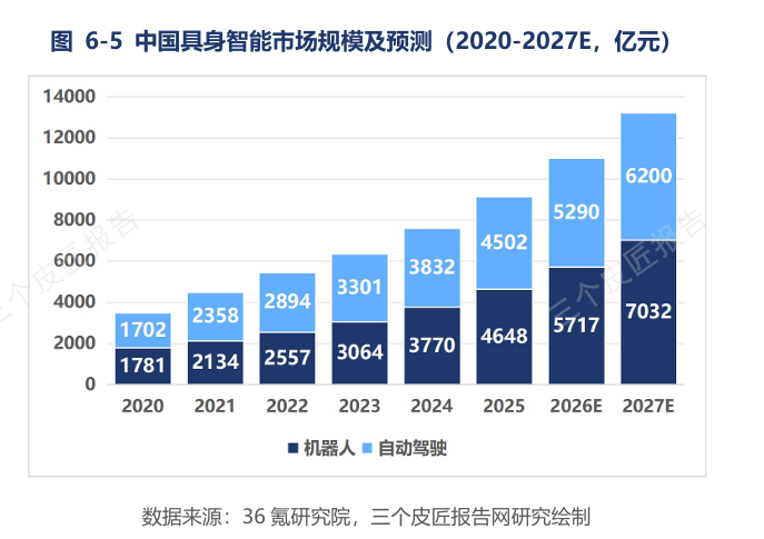 具身智能市场呈现“机器人”与“自动驾驶”双轮驱动。2027年机器人板块预计达7032亿元,自动驾驶6200亿元,机器人板块因品类多元化增速略快。