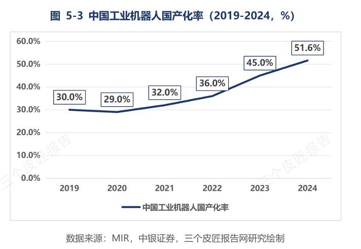 国产化率方面,本土品牌工业机器人市场份额从2019年的30.0%持续提升至2024年的51.6%,首次实现对外资品牌的反超。但在高端应用领域(汽车焊装线、精密电子装配),外资仍占主导。