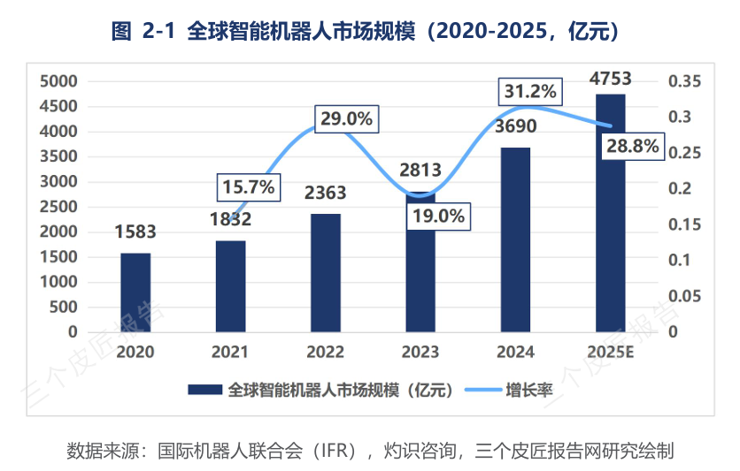 2020年至2025年,全球智能机器人市场规模从1583亿元增长至4753亿元,年均复合增长率达24.6%。2022年增速29.0%为阶段性高点,受益于疫情后供应链自动化需求集中释放。2025年增速预计为28.8%,市场总量逼近5000亿元。