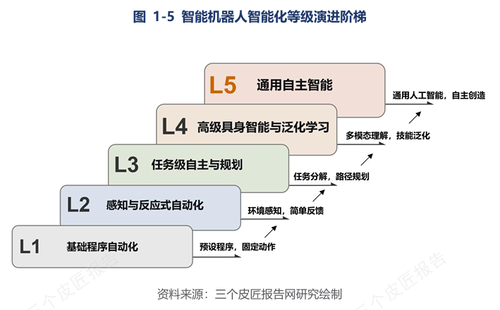 借鉴自动驾驶分级思路,智能机器人可划分为L1(基础程序自动化)到L5(通用自主智能)。目前家用和商用服务机器人大多处于L2级别,工业机器人处于L1向L2/L3的过渡阶段。研究界正集中攻克L3到L4的瓶颈,核心是大模型与机器人技术的结合。