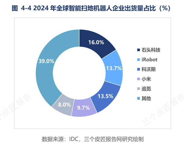 竞争格局上,2024年全球扫地机器人出货量前五中四家为中国品牌:石头科技(16.0%)首次超越iRobot(13.7%)登顶全球第一,科沃斯(13.5%)、小米(9.7%)、追觅(8.0%)紧随其后。