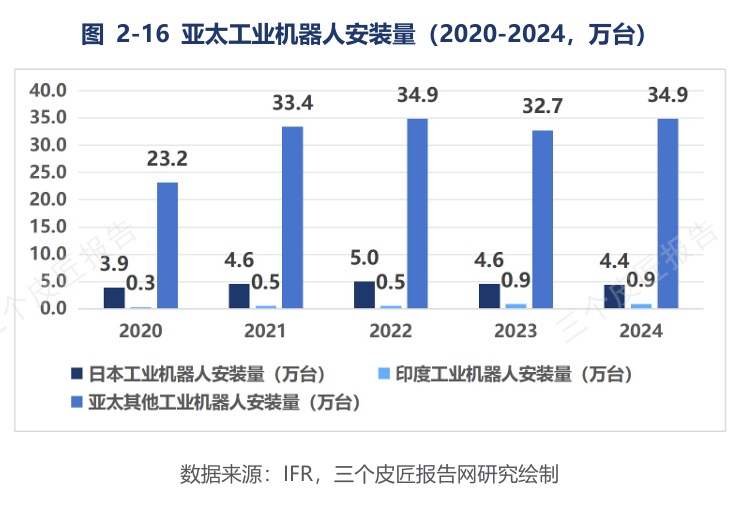 2024年全球工业机器人安装量54.2万台,亚太贡献了74%的新增部署。中国以29.5万台(占全球54%)居首,日本4.45万台保持全球第二,韩国3.06万台位列第四。美国安装量3.4万台,连续两年下滑;欧洲2024年安装8.5万台,同比下降7.6%。