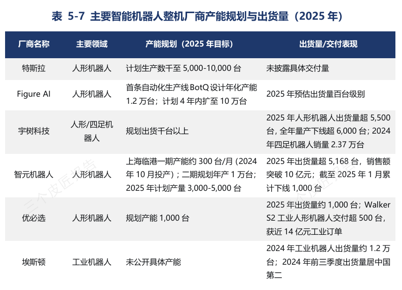 2025年被称为智能机器人“量产元年”。宇树科技人形机器人出货超5500台,智元机器人超5168台,优必选约1000台。埃斯顿工业机器人出货量约1.2万台,国产龙头维持万台级规模。