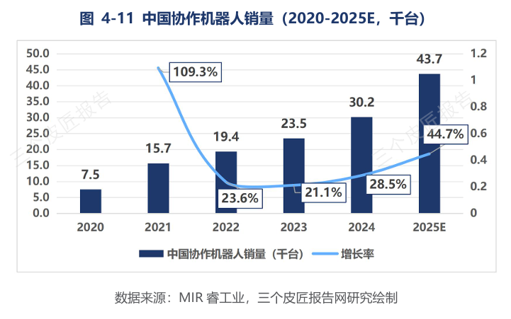2020年至2025年,中国协作机器人销量从7.5千台增长至43.7千台,年均复合增长率42.2%。2025年增速反弹至44.7%,主要驱动力来自汽车零部件、3C电子柔性装配线投资加速,以及移动协作机器人在仓储物流场景的放量。预计2028年销量将突破10万台