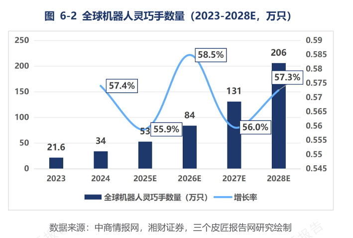 SLAM与自主导航方面,中国智能机器人空间感知解决方案市场规模预计2030年达357亿元,占全球45.4%。灵巧手出货量2023-2028年均复合增长率约56.9%,每台人形机器人需要2只灵巧手。
