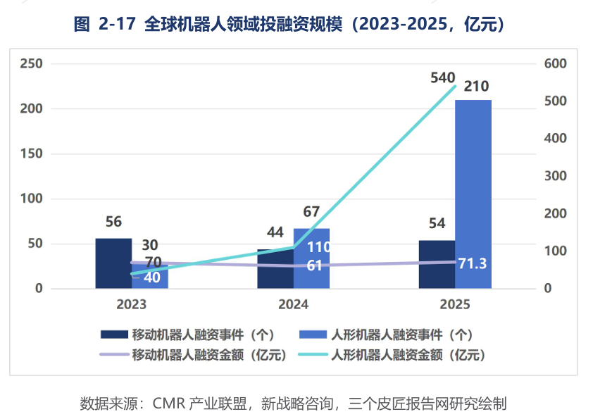 2023年至2025年,全球人形机器人融资事件从30个激增至215个,融资金额从40亿元飙升至578亿元,三年增长12.5倍。移动机器人融资保持平稳(约70亿元/年),资本高度集中于具身智能本体和机器人AI基础模型。