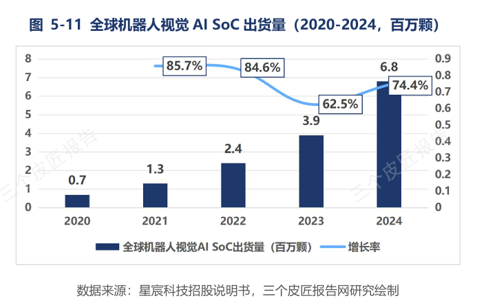 芯片领域,中国AI计算加速芯片市场规模从2020年的176亿元增长至2025年的2398亿元,年均复合增长率68.4%。机器人视觉AI SoC出货量从2020年的70万颗增长至2024年的680万颗,年均复合增长率76.5%。