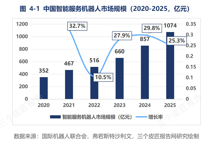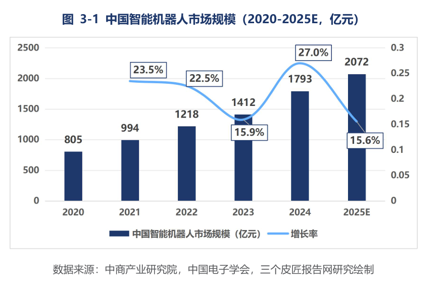 2020年至2025年,中国智能机器人市场规模从805亿元增长至2072亿元,年均复合增长率约20.8%。2024年增速强劲反弹至27.0%,创下年度最大增量(净增381亿元),受益于智能割草机器人出口放量、人形机器人小批量应用以及商用服务机器人场景恢复。