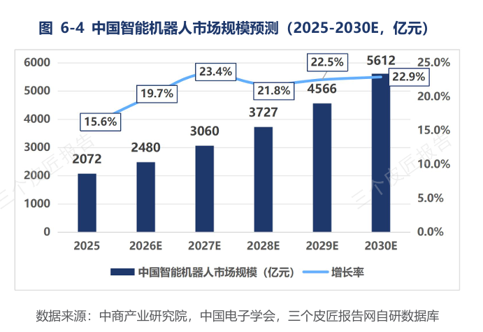 全球智能机器人市场预计2029年突破万亿元(10058亿元)。中国市场规模预计2030年达5612亿元,2025-2030年均复合增长率约22.1%,持续高于全球平均水平。