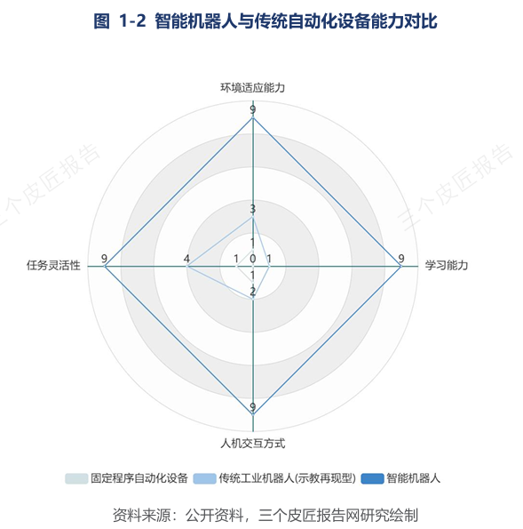 与传统工业机器人相比,智能机器人具备环境适应能力、任务灵活性、人机交互方式和学习能力四个维度的断层优势。传统机器人只能在结构化环境中执行预设轨迹,而智能机器人可以在非结构化、动态变化的环境中自主应对。