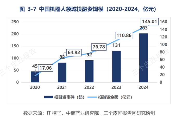 2025年中国机器人领域融资事件达576起,总规模突破500亿元,较2024年实现翻倍以上增长。具身智能/人形机器人是最大吸金赛道,智元、宇树、银河通用等完成多轮大额融资。
