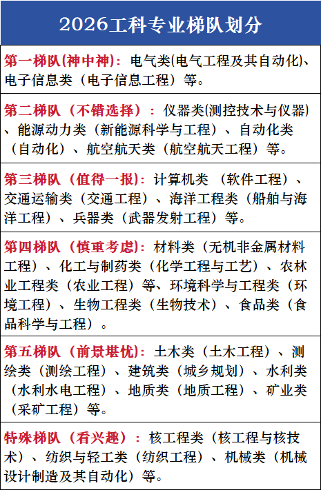 2026年选工科专业,没有绝对的“好专业”,也没有绝对的“坏专业”,只有适合不适合。第一梯队的专业再好,理科基础差、不喜欢,也很难坚持;第五梯队的专业再“坑”,有情怀、愿意深耕,也能做出成绩。希望这份梯队划分,能帮准考生和家长理清思路,避开坑、选对专业,不负4年青春,毕业后既能找到满意的工作,也能实现自己的价值~互动话题:你最看好哪个梯队的工科专业?评论区聊聊!
