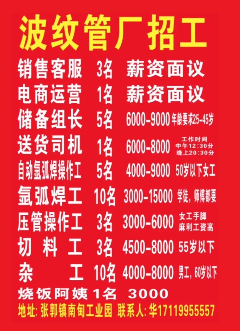 招聘地址:张郭镇南甸工业区内