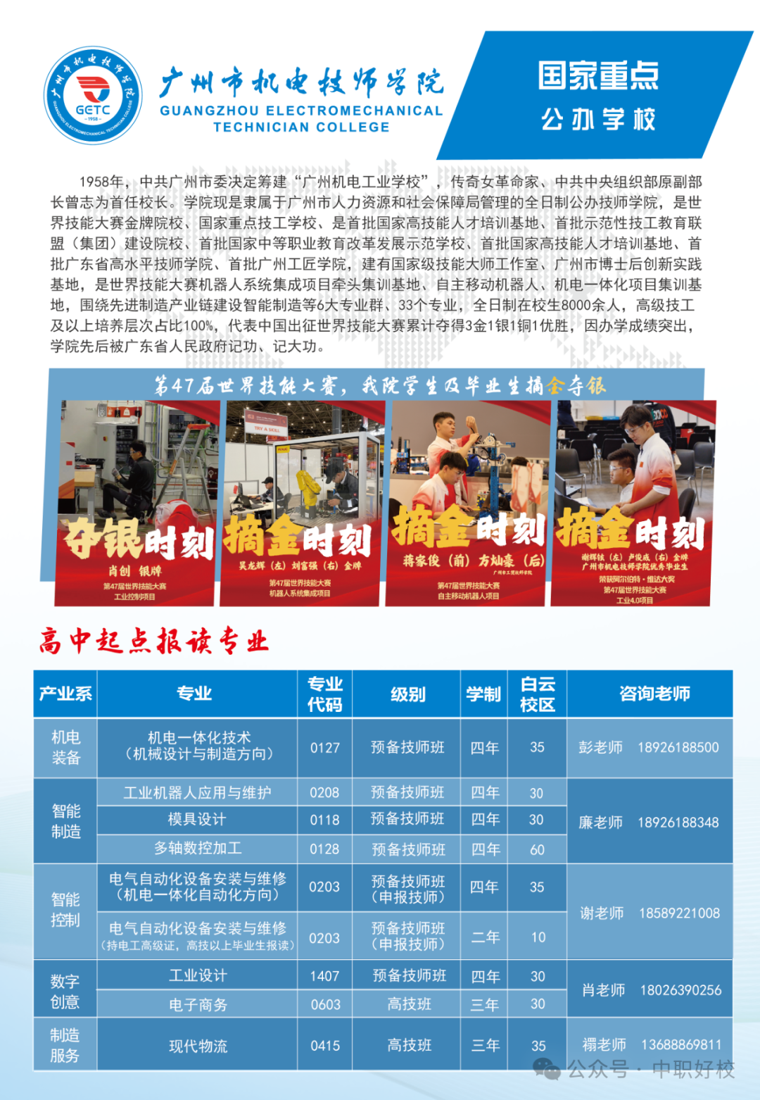 广州市机电技师学院创办于1958年,是一所隶属于广州市人力资源和社会保障局的公办国家级重点技师学院,也是广东省首批“高水平技师学院”建设单位。学院历经六十余载的发展积淀,始终秉承“厚德强技、知行合一”的校训,以培养高素质技术技能人才为核心使命,在机电制造、智能制造、汽车技术、信息技术等领域形成了鲜明的办学特色,为粤港澳大湾区乃至全国的产业发展输送了大批优秀技能人才。