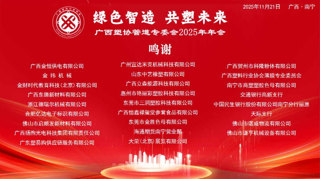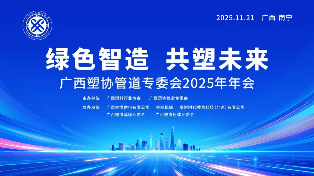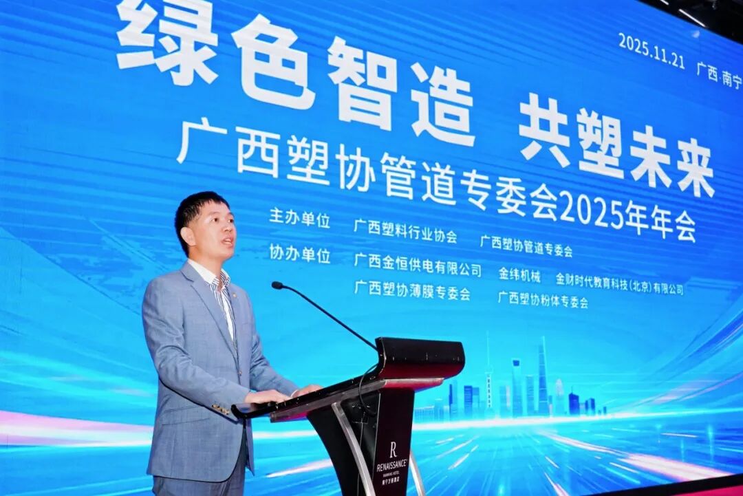 11月21日,广西塑料行业协会管道专业委员会2025年年会在南宁万丽酒店隆重举行,会议主题为“绿色智造・共塑未来”。会议由广西塑料行业协会、广西塑料行业协会管道专业委员会主办,金纬机械、广西金恒供电有限公司、金财时代教育科技(北京)有限公司、广西塑料行业协会薄膜专业委员会、广西塑料行业协会粉体专业委员会协办。
