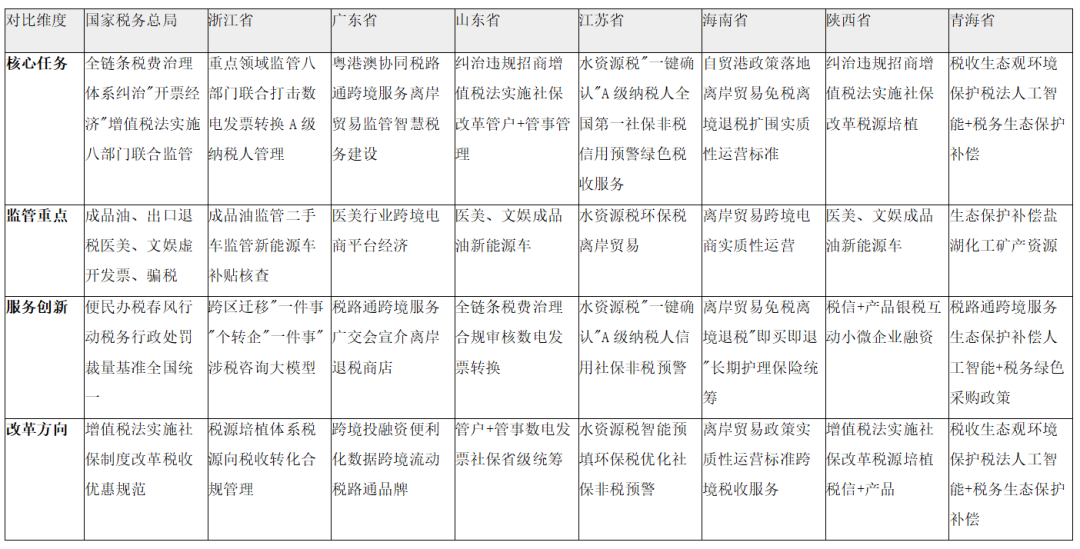 1.统一部署全链条税费治理体系:国家税务总局首次提出打造"全链条高效能税费收入治理体系",各省积极响应,如山东省提出"打造全链条高效能税费收入治理体系",浙江省提出"紧盯重点领域加强税收监管",江苏省提出"水资源税'一键确认'申报智能预填",均体现了对国家税务总局部署的落实。