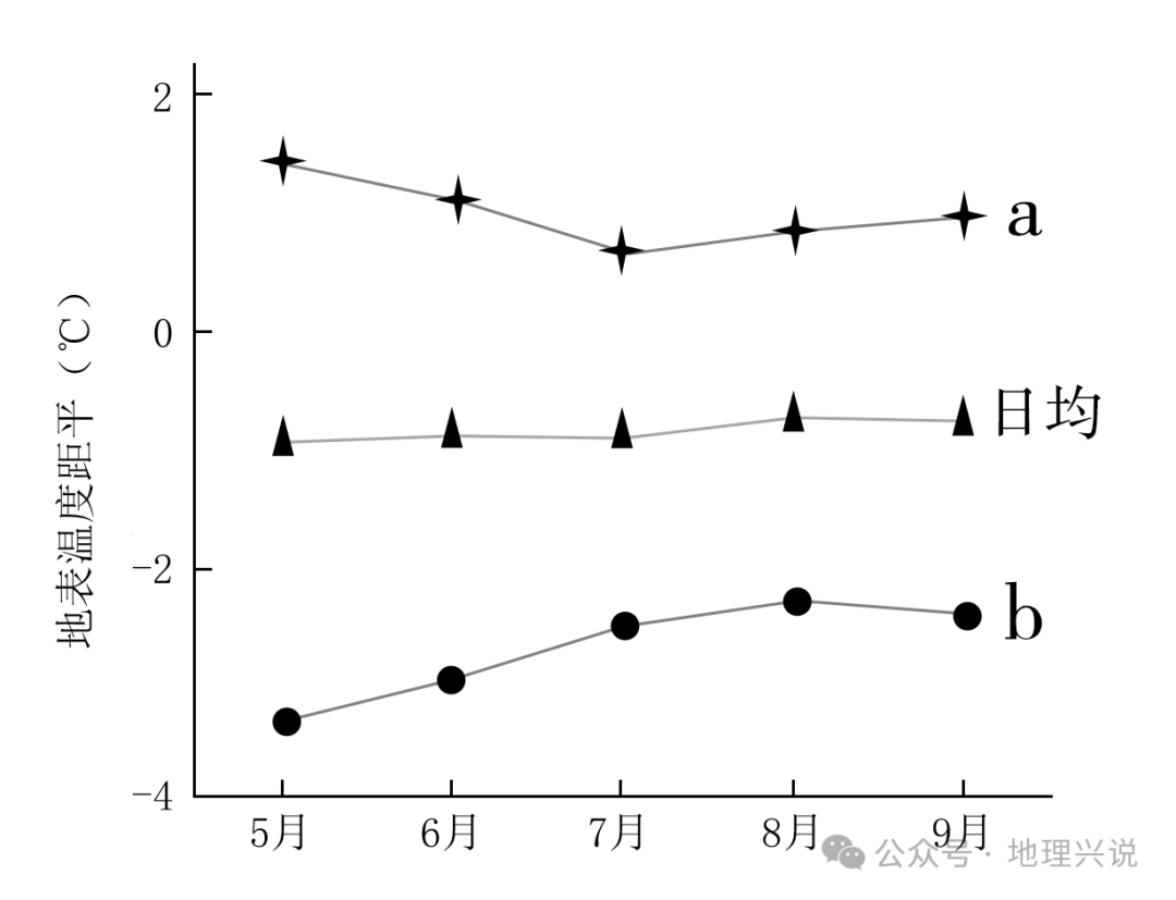 5.木本植物扩张后,会影响生长季林下地表昼夜温度。白天,树冠会遮挡到达地面的太阳辐射,林下裸露地表吸收太阳辐射较少,与扩张前相比,白天温度降低;夜晚,树冠削弱了地面辐射,使得林下裸露地表散失的热量相对较少,与扩张前相比,夜晚温度升高。 曲线b地表温度距平为负值,代表白天,树冠削弱到达地表的太阳辐射,从而降低地表温度,C正确,D错误;图中曲线a 地表温度距平为正值,代表夜晚,树冠削弱了地面辐射,使得林下裸露地表散失的热量相对较少,提高了地表温度,AB错误。故选C。