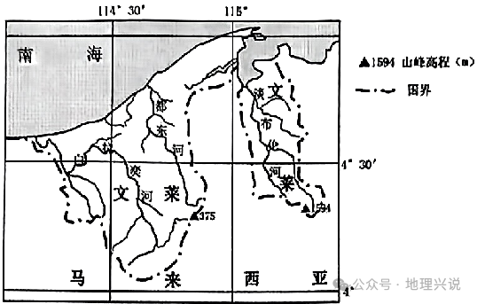 文莱国土面积5765平方千米,人口45万。20世纪70年代以来,石油、天然气及公共服务业快速发展,非农业人口占比超过95%。国内蔬菜、水果、肉类、大米等农产品自给率较低。2014年9月,文莱与我国广西共同建设“中国—文莱农业产业园”,这是自2004年广西连年承办东盟博览会以来与文莱合作的最大农业项目。产业园以农产品生产及加工、良种培育试验等为建设内容,产品满足文莱市场需求。下图示意文莱地理位置。据此完成下列小题。