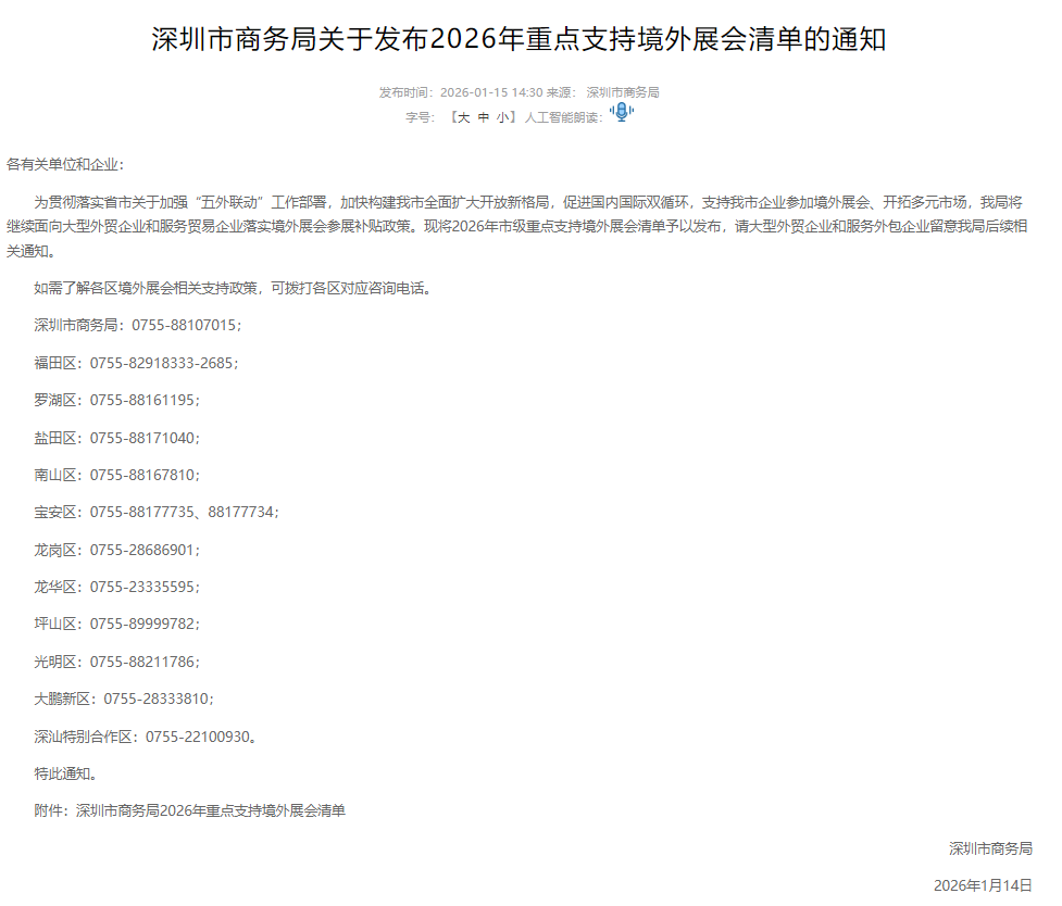 -深圳市商务局发布2026年深圳市重点支持境外展会清单