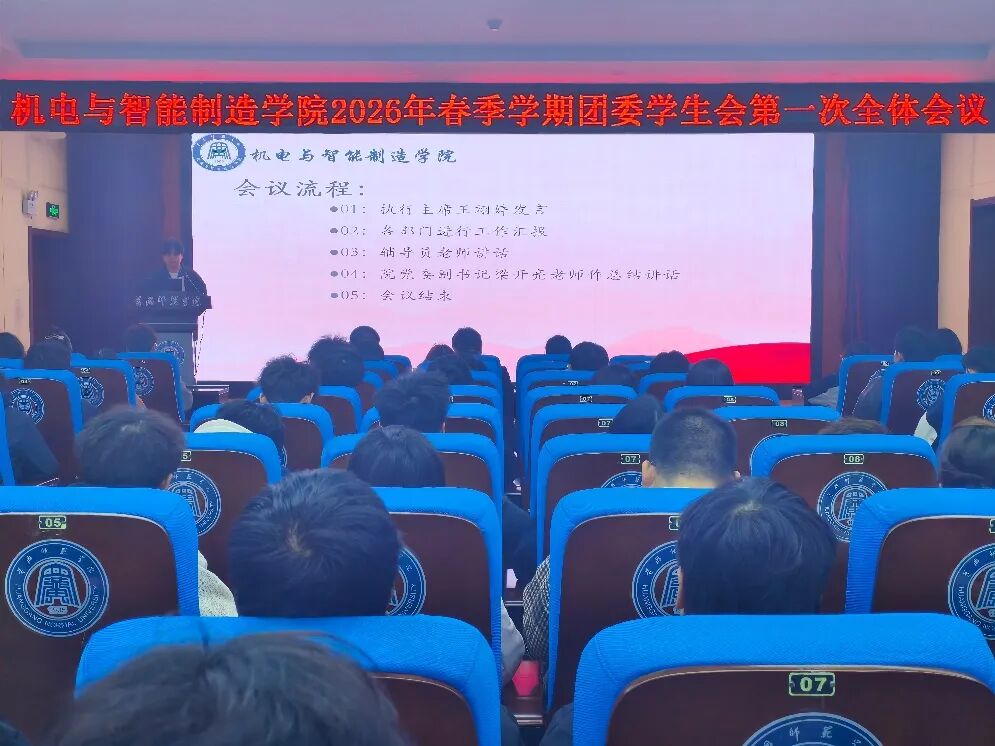 3月19日晚,机电与智能制造学院2026年春季学期团委学生会第一次全体会议在致远楼三楼多功能报告厅召开。院党委副书记梁开亮出席会议并讲话,辅导员邱锐、闫吉玲及团委学生会全体成员参加会议。