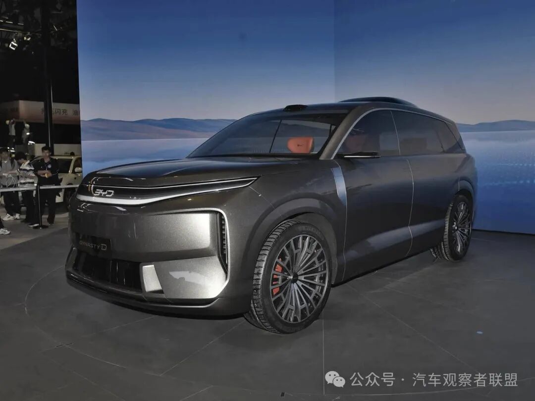 比亚迪王朝网推出的全尺寸 SUV 概念车Dynasty-D,采用全新设计语言,前脸依稀可见唐的影子,但更显霸气,车身尺寸更大。还提供了隐藏式门把手、电子外后视镜和对开门等设计;