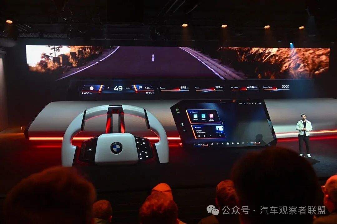 宝马则带来今年在美国CES展出过的新世代概念车,展示了其对未来出行的前瞻性思考。例如,宝马新世代 X 概念车,以 “超感智能座舱” 重新定义人机交互,十字造型多功能方向盘与悬浮式平行四边形液晶屏构成视觉核心,全景视域桥技术将导航、车速等关键信息投射至前挡风玻璃底部。搭载 “驾控超级大脑”(Heart of Joy),将动力、底盘、制动、转向等核心功能整合为毫秒级响应的神经网络,算力较传统系统提升 10 倍。