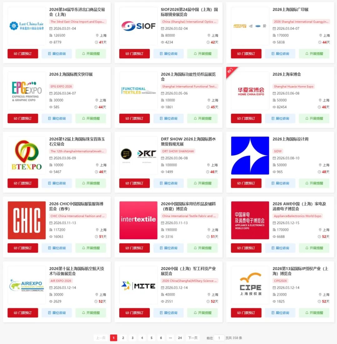 2026年上海将举办多场各行业展会,涵盖了百货、婚嫁、珠宝、袜业、帽子、家居、复合材料、先进陶瓷、粉体加工、电机、船舶、运动、钓具、运动、旅游、餐饮、家具、酒店用品、清洁用品、环保、物流、医药、美容、校服园服、纺织、服装、食品、烘焙、遮阳、家用装饰、地面材料、家用装饰、电子、汽车配件、汽车制造技术、暖通、水处理、管材、空气净化、泵阀、环保、食品配料、保健、食品加工、食品、文化、汽车、金属加工、铝工业、汽车制造技术、孕婴童、礼品、百货、燕窝、混凝土、表面处理、显示、渔业、医疗器械、家居、家具、五金、教育、孕婴童、品牌授权、玩具、口腔、动力传动、物流、压缩机、包装、食材、自有品牌、新材料等行业,小编已为大家整理好关于2026上海全年展会(最新版)请查收,助你高效逛展。文末识别二维码,限时免费获取上海展会门票哦~
