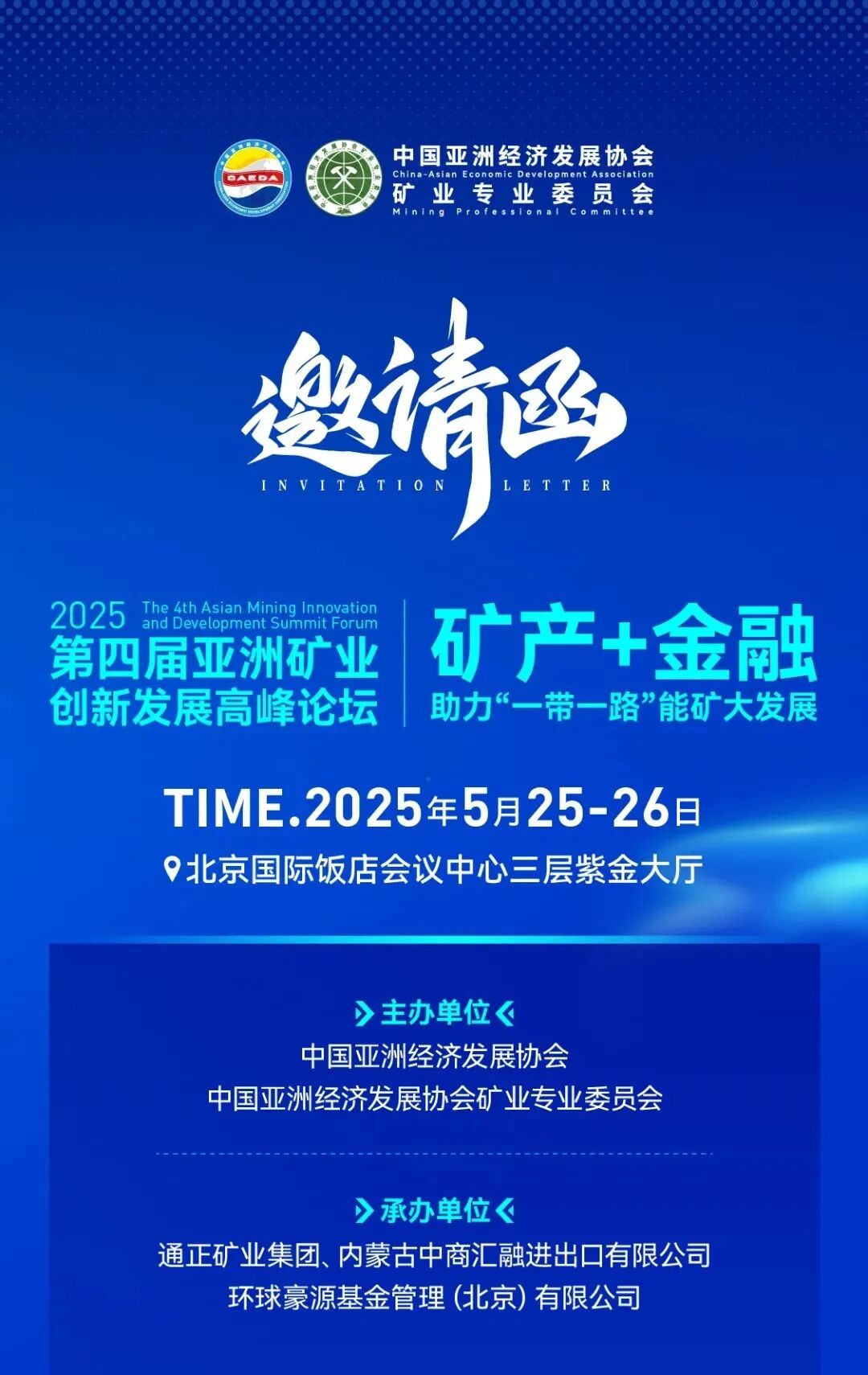 中国亚洲经济发展协会矿业专业委员会将于2025年5月25日-26日在北京举行“第四届亚洲矿业创新发展高峰论坛”。此次论坛的主题为“‘矿产+金融’助力一带一路能矿大发展”。