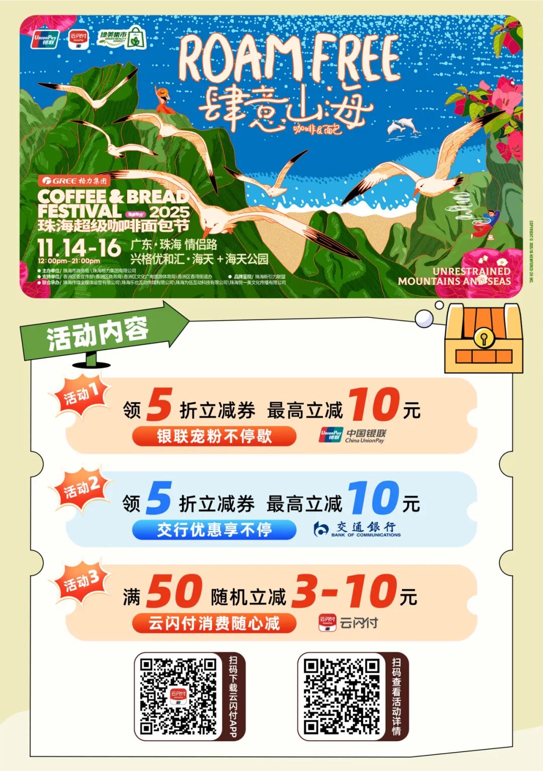 本次超级咖啡面包节,珠海各大银行倾力助阵,发放5折立减劵、满额立减福利!