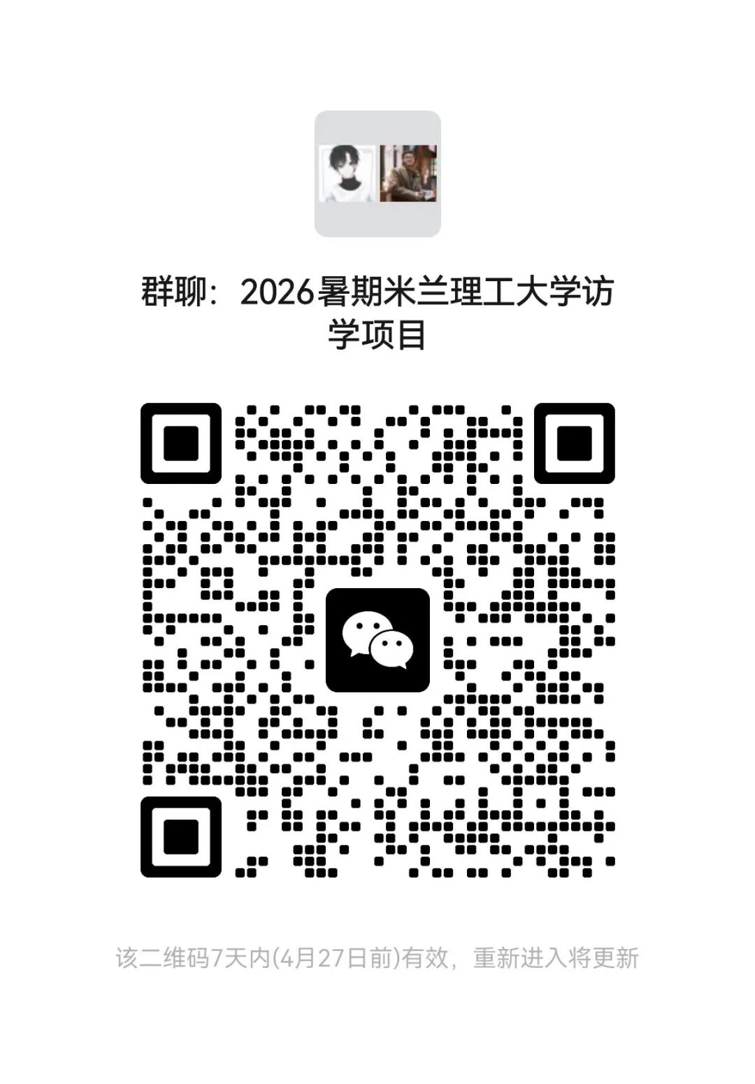 感兴趣的同学可扫描二维码填写信息线上报名,并进入2026暑期米兰理工大学研学咨询群,获取项目最新资讯、答疑解惑!