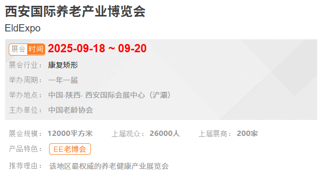 西安国际养老产业博览会(EldExpo)是该地区最权威的养老健康产业展览会。将聚焦中国养老健康产业发展趋势,依托市场需求,组织汇聚全球最前沿的养老健康行业的服务、产品、技术及解决方案等企业参加。