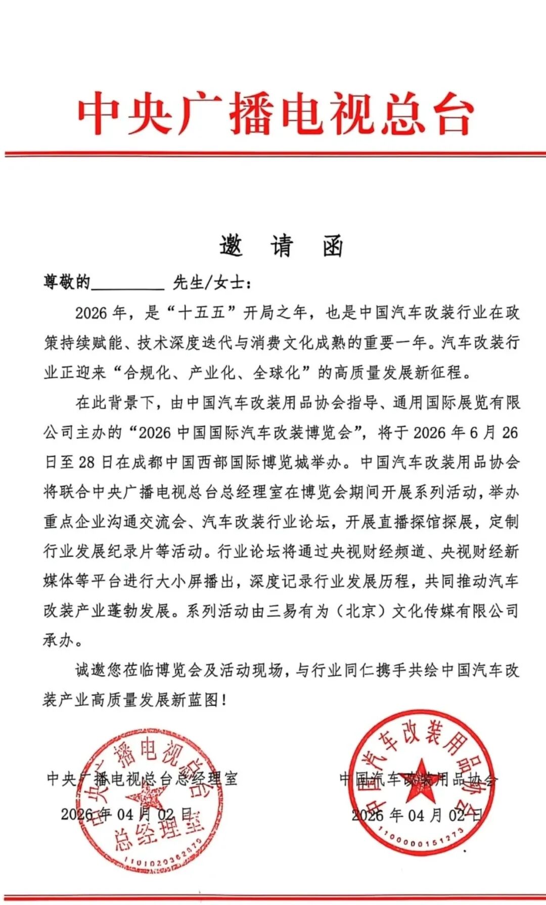 经国家商务部批准,由中国汽车改装用品协会专业指导、通用国际展览有限公司主办的 2026中国国际汽车改装博览会,定于 6月26日—28日,在成都·中国西部国际博览城盛大举办!