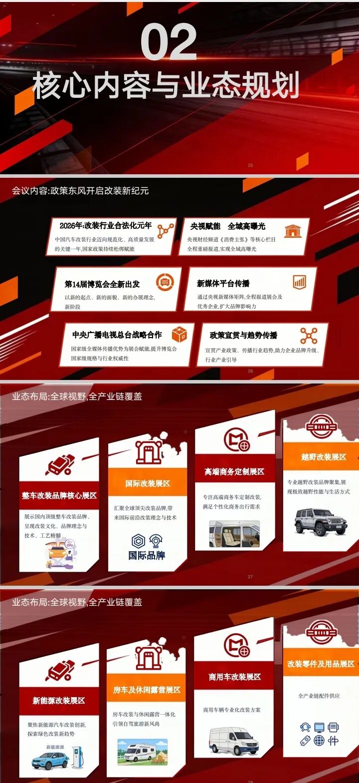 本届博览会以 "点燃激情 改装未来——新改装、新消费、新生活" 为核心主题,倾力构建集政策宣贯、技术展示、产业对接、文化传播、国际交流于一体的行业顶级生态平台,实现汽车改装全品类、全链条覆盖:
