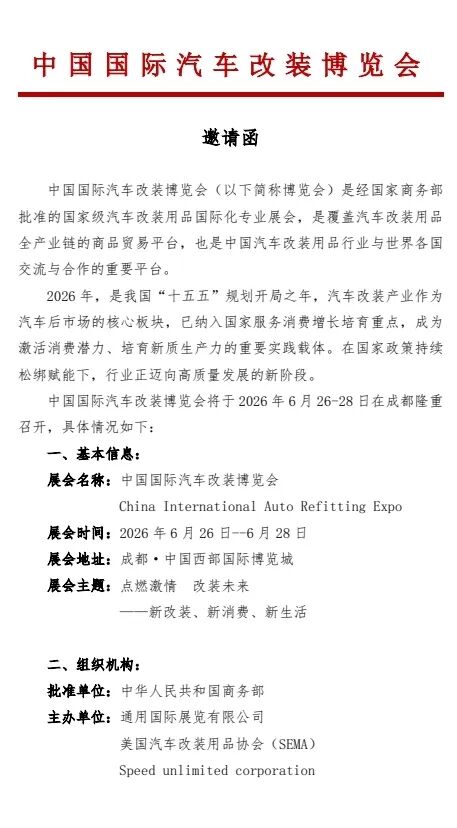 2026中国国际汽车改装博览会,不仅是产品与技术的炫技舞台,更是中国汽车改装行业规范发展、合作共赢、走向世界的重要里程碑。