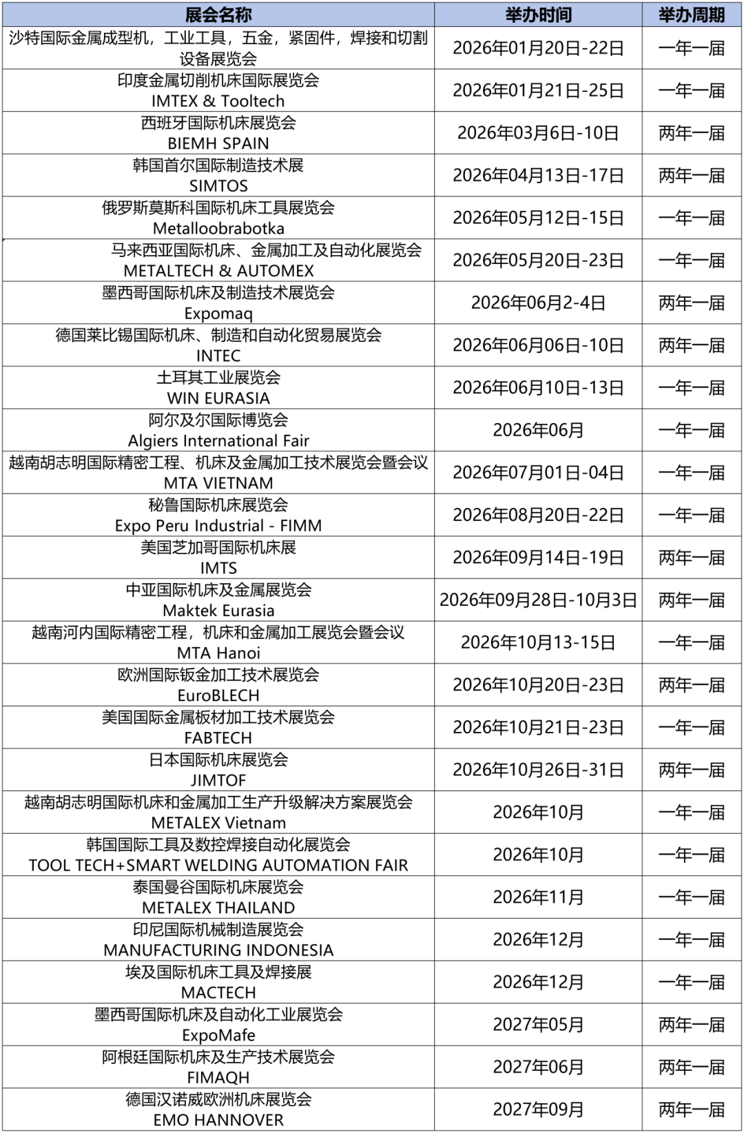 2026年全球机床金属加工展会计划表