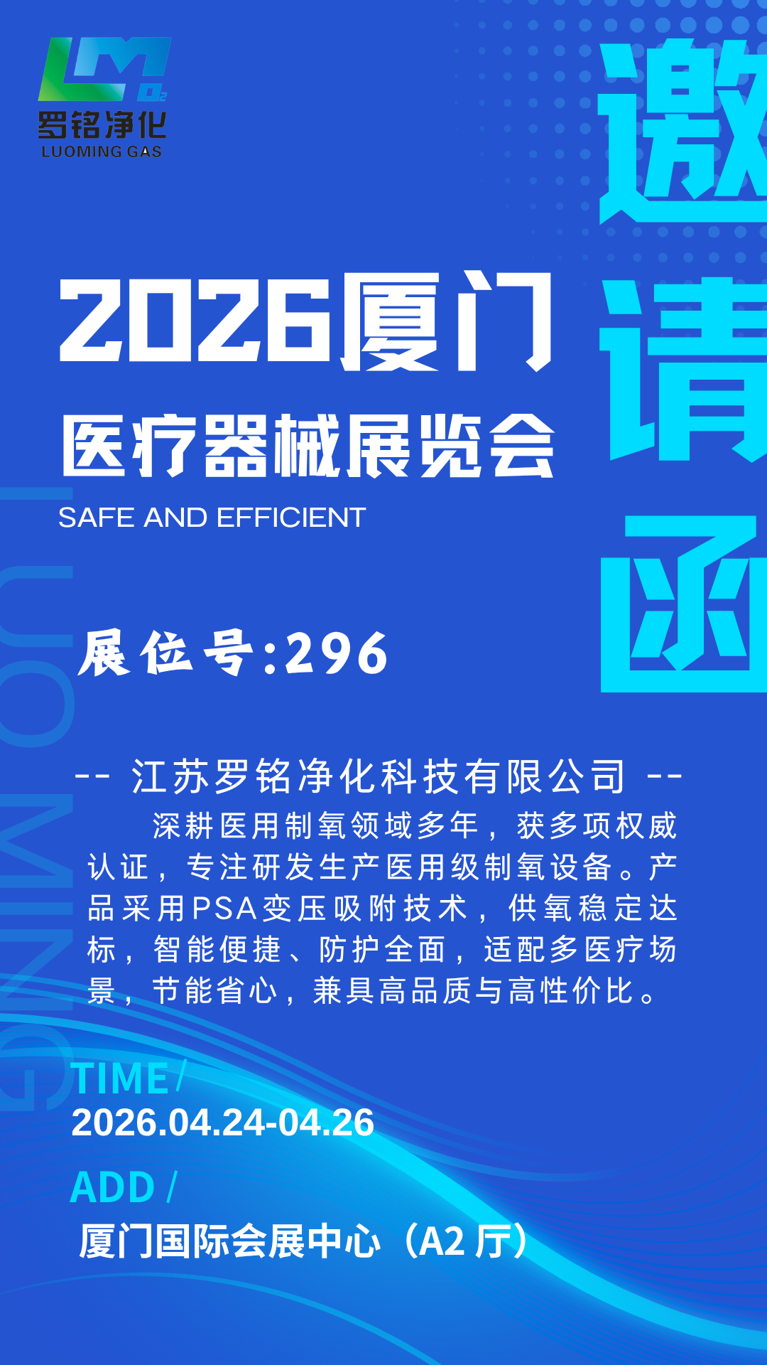 春风送暖,盛会将至。2026 厦门医疗器械展览会即将盛大启幕,江苏罗铭净化科技有限公司诚挚邀请您莅临我们的展位,共话医用制氧领域的技术创新与行业发展!