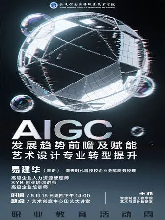“AIGC发展趋势前瞻及赋能艺术设计专业转型提升”讲座将在印艺大讲堂举行,行业专家易建华将带来关于AIGC前沿知识,助力专业发展。