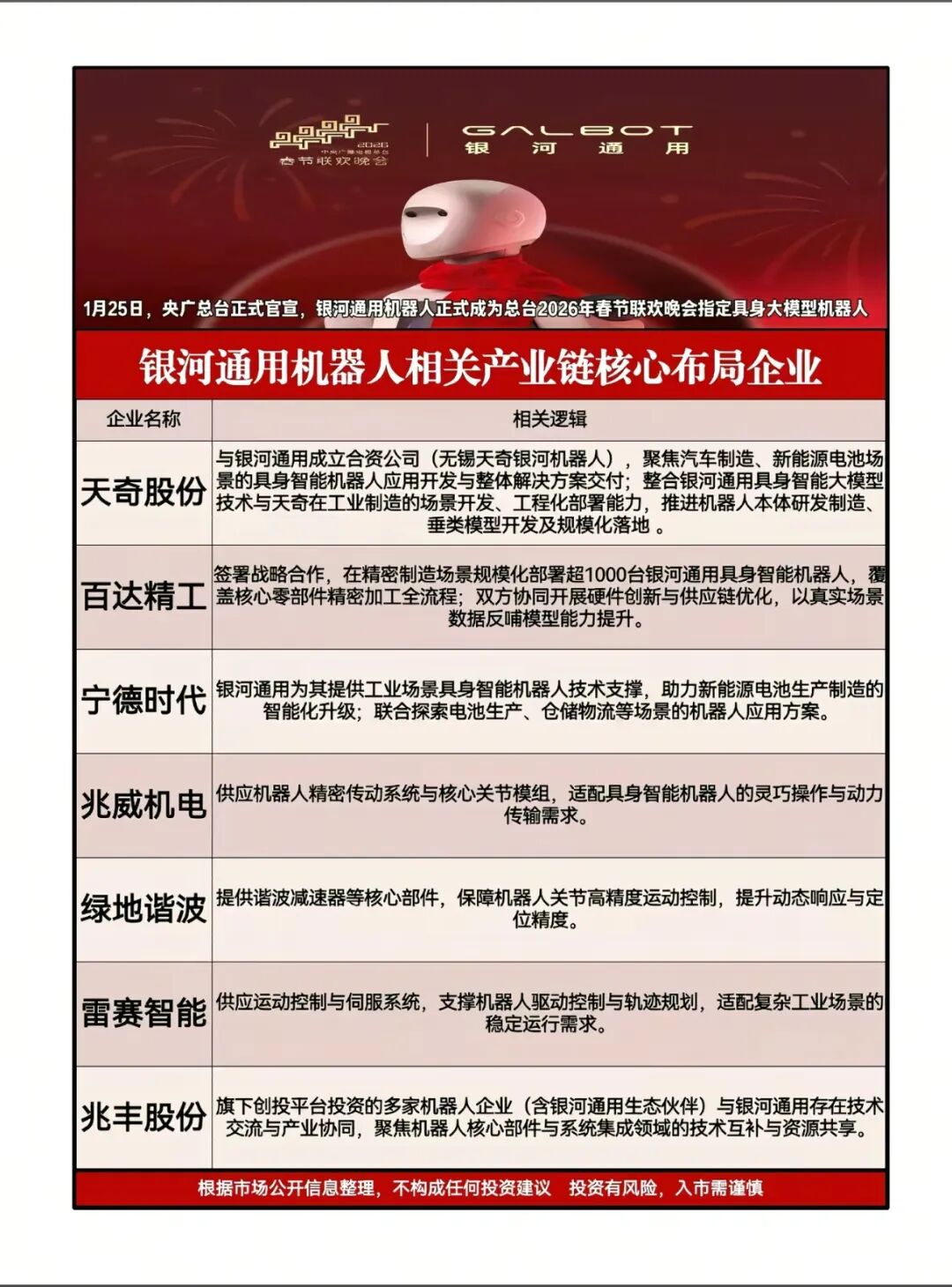 核心关联:旗下创投平台投资的多家机器人企业(含银河通用生态伙伴)与银河通用存在技术交流与产业协同,聚焦机器人核心部件与系统集成领域的技术互补与资源共享。